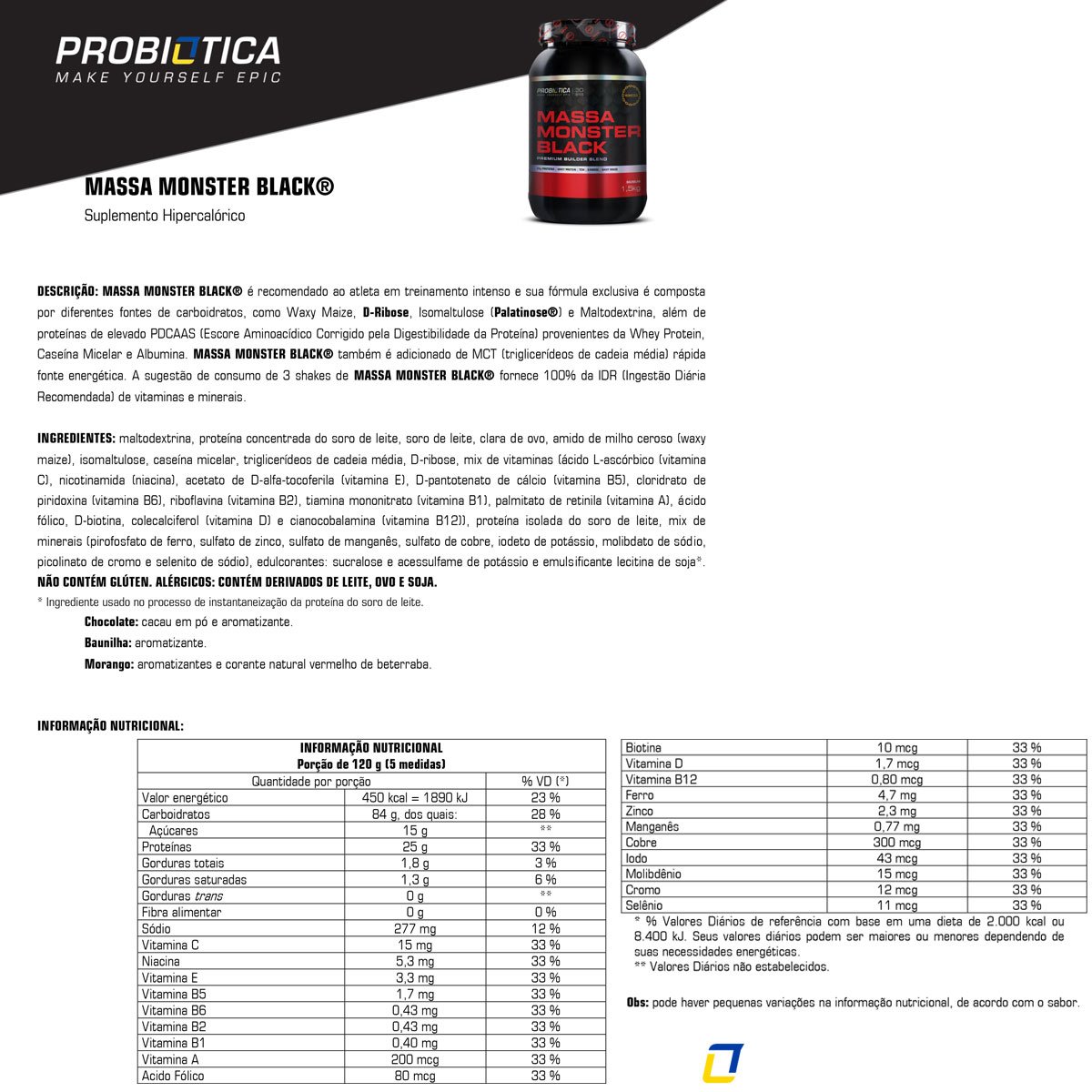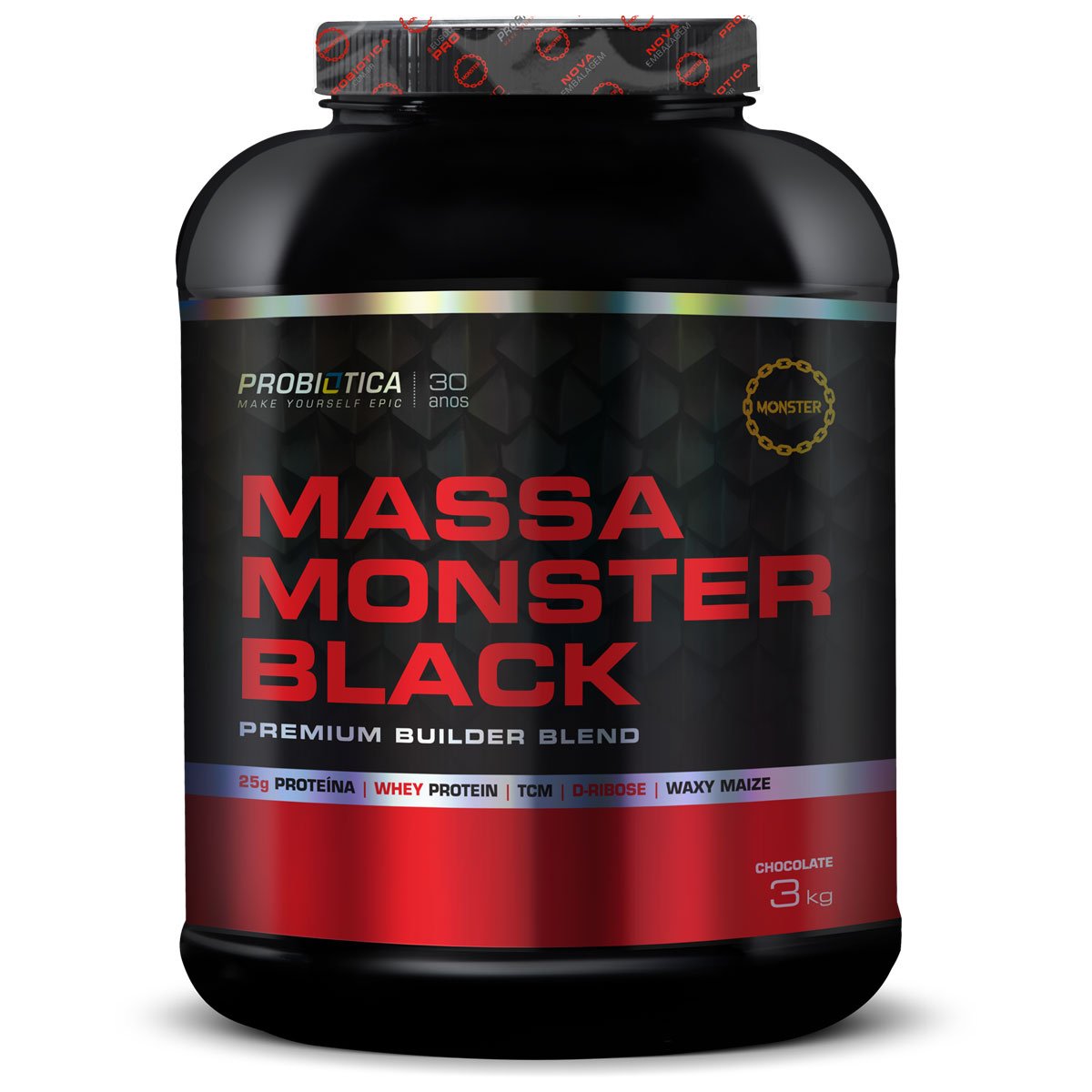 A Massa Monster Black 3kg - Probiótica é uma opção nutritiva e saborosa para o seu dia a dia, trazendo uma combinação de proteínas, carboidratos, vitaminas, minerais e baixo teor de gordura.Nome: Massa Monster Black 3kg - ProbióticaGênero: UnissexPeso/Quantidade: 3kgRecomendações de Uso: Bata no liquidificador, mixer ou coqueteleira 5 medidas** (em média 120g) de MASSA MONSTER BLACK® em 300ml de água (1 copo grande). Experimente também com leite, frutas ou sua bebida preferida. Tome 3 shakes (3 porções de 120 g) ao longo do dia. **A porção no medidor pode variar em função da densidade e outras características do produto.Importante: Este produto pode sofrer pequenas alterações de cor e sabor, devido ao processo de fabricação, não comprometendo sua qualidade nutricional.Validade: 24 meses - a partir da data de fabricação desde que respeitados os cuidados de conservação.Validade pode variar conforme o lote.SAC: 0800-105242OBS: Nutrientes podem variar conforme o loteOrigem: Nacional