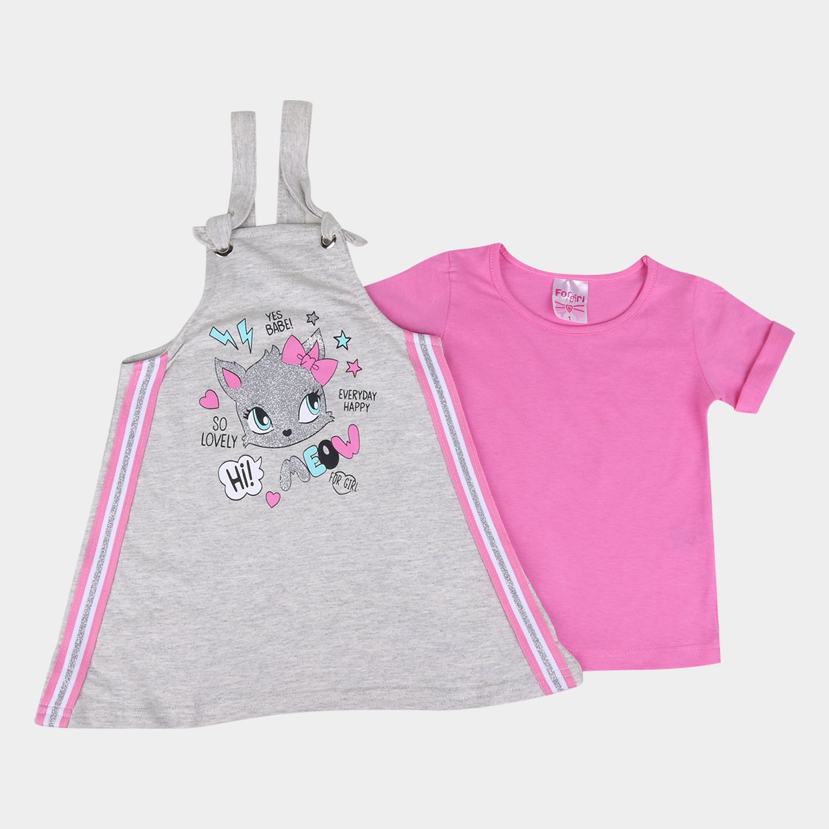 Conjunto Bebê Salopete For Girl Gatinho e Blusa Básica Feminino