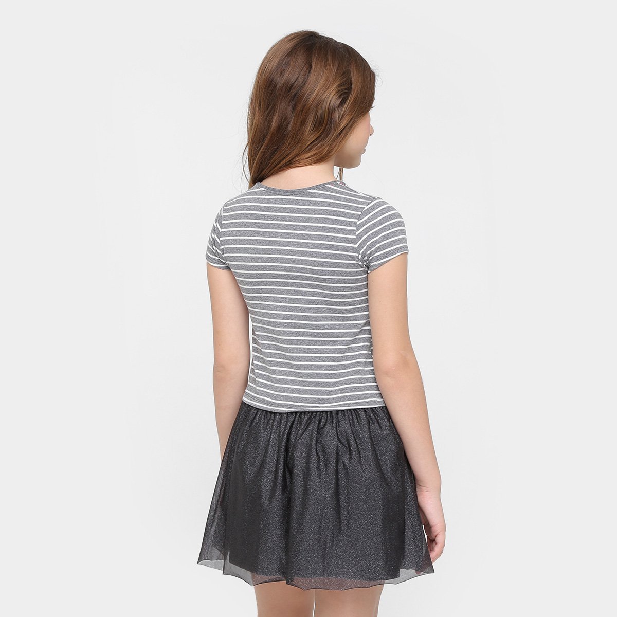 O Vestido Lilica Ripilica Listrado Estrelas Infantil traz listras horizontais e apliques com acabamento de glitter. Tem design com manga curta em estilo blusê, com pontos de brilho na saia.