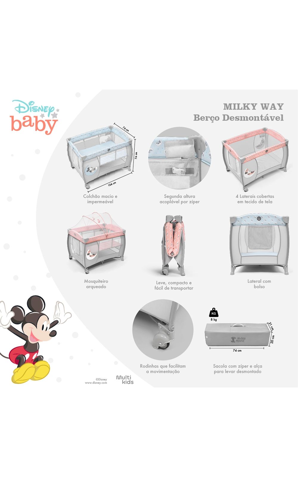 O Milky Way vem com um mosquiteiro arqueado com estrutura para prender dois brinquedinhos, que vão ajudar a relaxar o bebê para o soninho. Suas quatro laterais em tecido de tela oferecem boa circulação de ar e permitem que os pais espiem o bebê de qualquer ângulo. O colchão é macio e em material impermeável e conta com duas rodinhas para ajudar a transportar pelos ambientes da casa.
