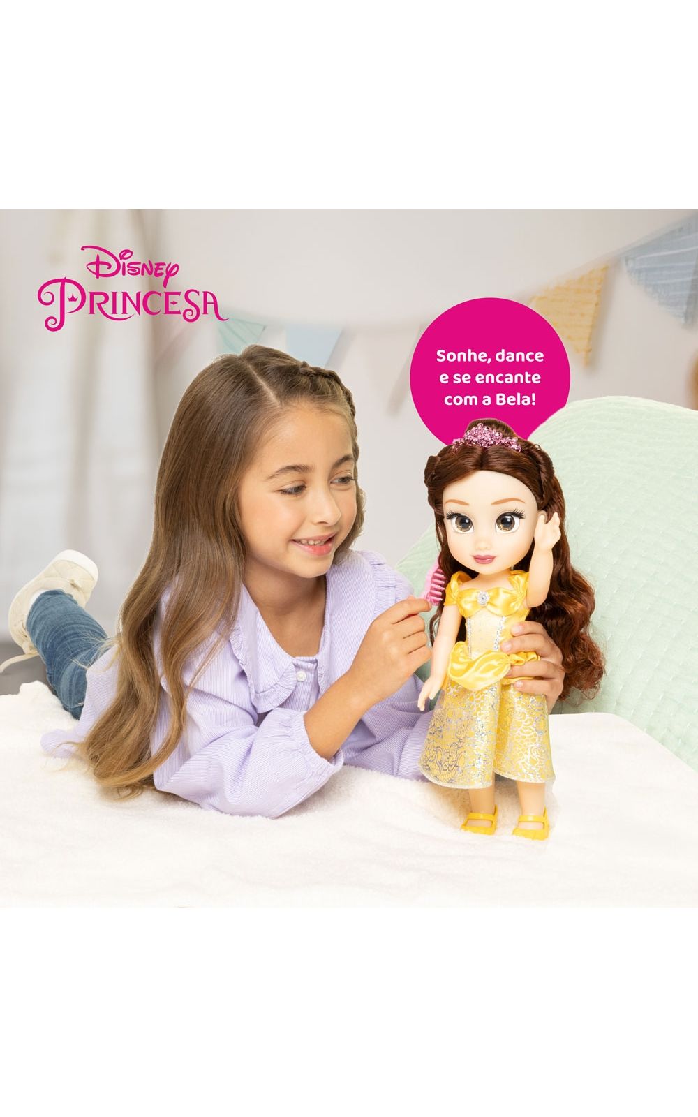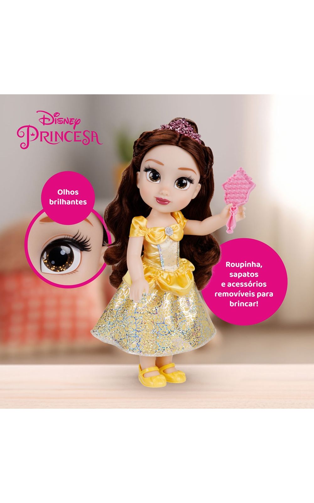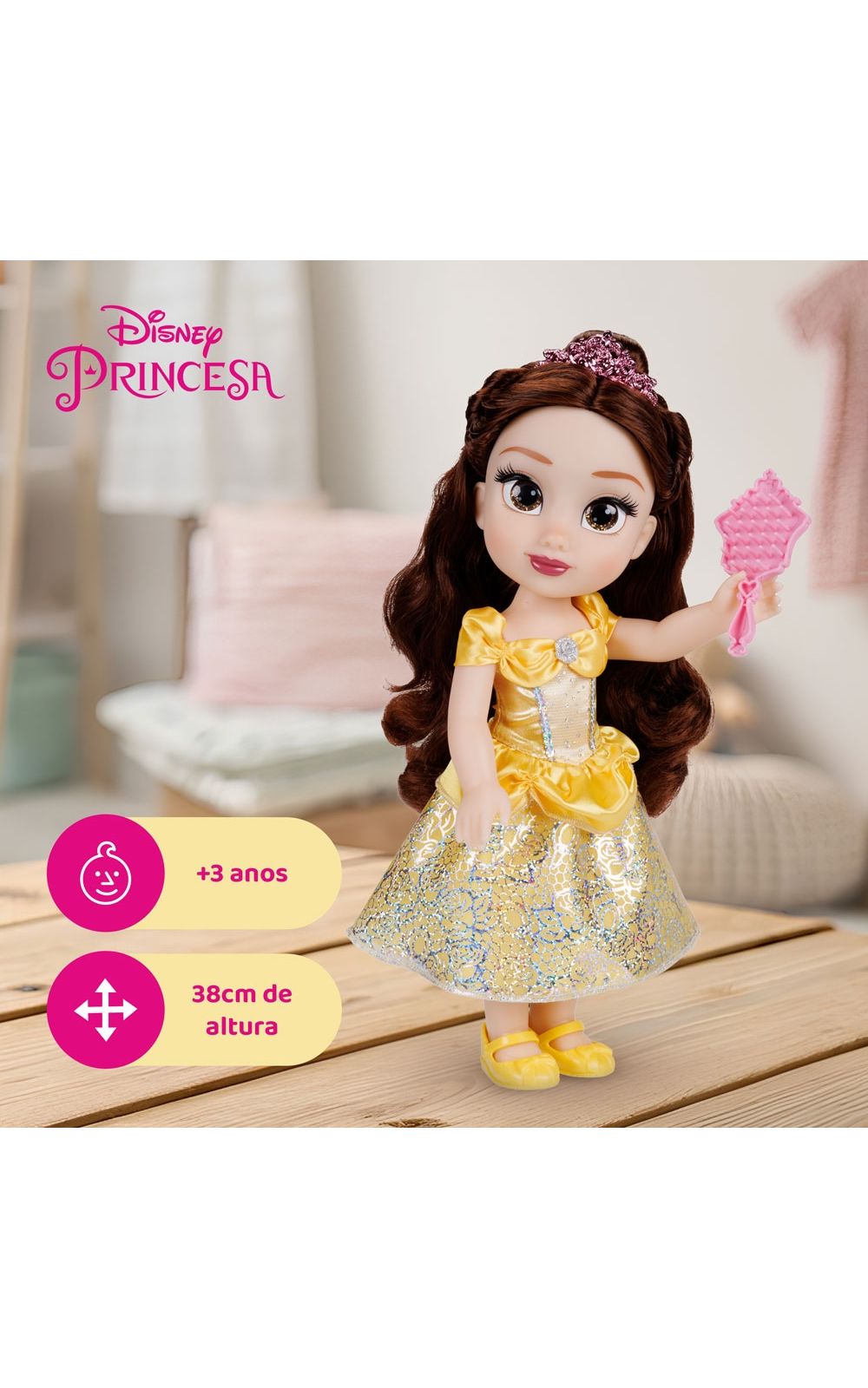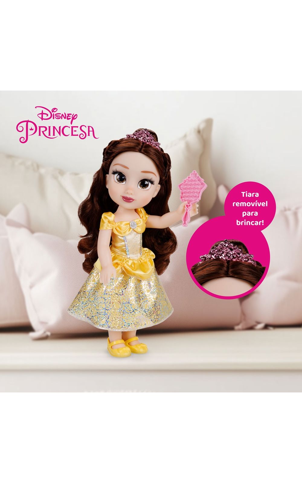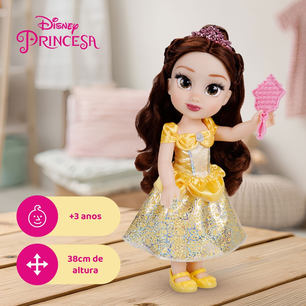 Compartilhe aventuras eternas e cotidianas com uma amiga querida, com a linda Boneca Disney Princess Bela! Vestida em seu icônico vestido amarelo e com belos detalhes de glitter, Belle é mais bonita que uma rosa e está pronta para se juntar a você em qualquer brincadeira! Essa linda boneca possui olhos brilhantes de glitter, mede 38cm de altura e acompanha uma tiara e um lindo par de sapatos.