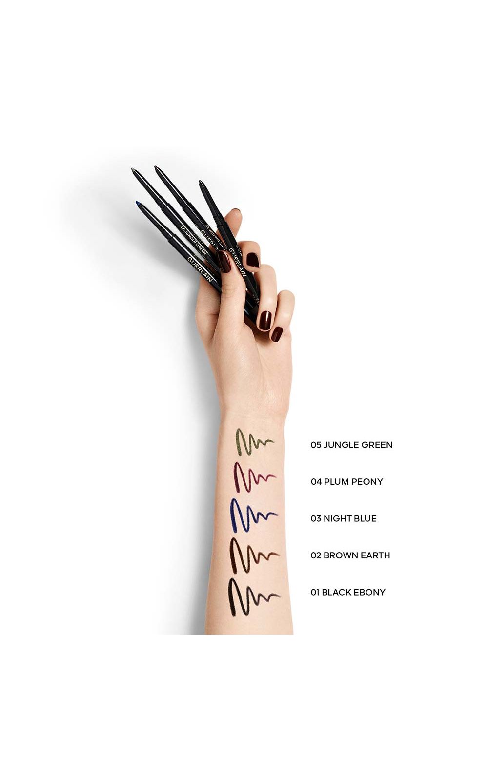 Guerlain criou uma gama de lápis com uma textura cremosa ultra-confortável. Lápis de Olhos Intenso Longa Duração & à Prova D'água possui uma seleção de cinco tons inspirados nas fascinantes cores da natureza garante um resultado intenso, duradouro e à prova dágua.