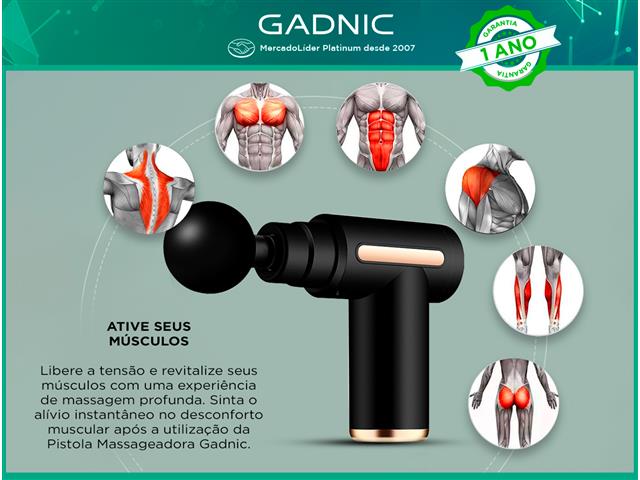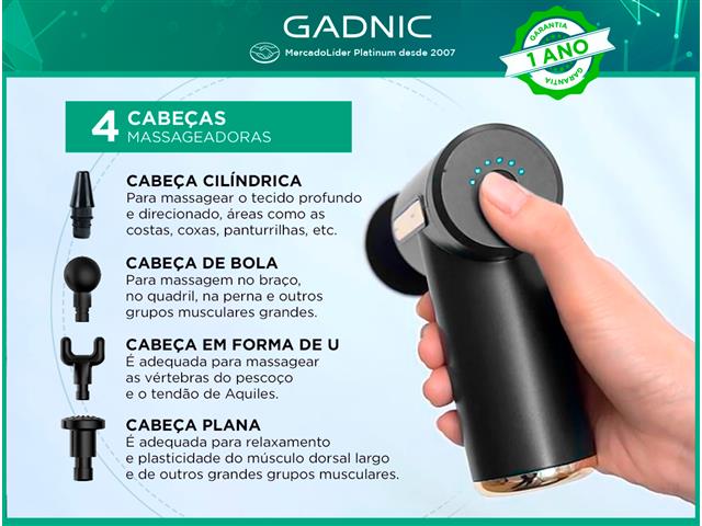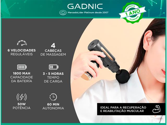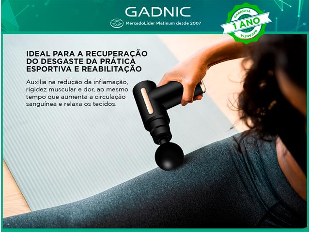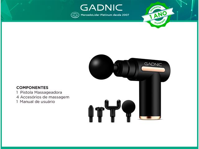 Pistola Massageadora GADNIC Esta Pistola de Massagem é ideal para a recuperação muscular após a prática esportiva, reabilitação após lesões ou dores musculares. Com suas 6 velocidades de massagem e 4 cabeças massageadoras, ajuda a reduzir a inflamação, a rigidez muscular e a dor, aumentando a circulação sanguínea e relaxando os tecidos.