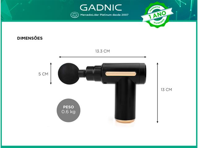 PRINCIPAIS CARACTERÍSTICAS:Pistola Massageadora GADNICEsta Pistola de Massagem é ideal para a recuperação muscular após a prática esportiva, reabilitação após lesões ou dores musculares. Com suas 6 velocidades de massagem e 4 cabeças massageadoras, ajuda a reduzir a inflamação, a rigidez muscular e a dor, aumentando a circulação sanguínea e relaxando os tecidos.ESPECIFICAÇÕES DO PRODUTO: Tipo de Carregamento: USB 6 Velocidades Ajustáveis: até 2500 RPM Capacidade da Bateria: 1800 mAh Potência: 50W Número de Cabeças: 4 Duração da Bateria: 1 hora Tempo de Carregamento: 3 - 5 Horas Peso: 0,6 kg Dimensões: 13,3 x 13 x 5 cm Garantia de 12 meses contra defeito de fabricaçãoIMAGENS MERAMENTE ILUSTRATIVAS