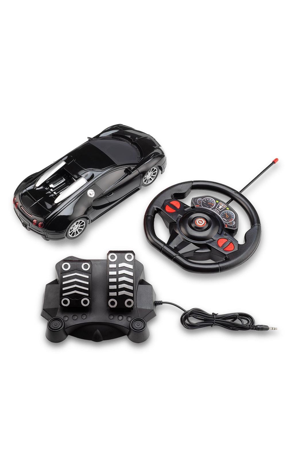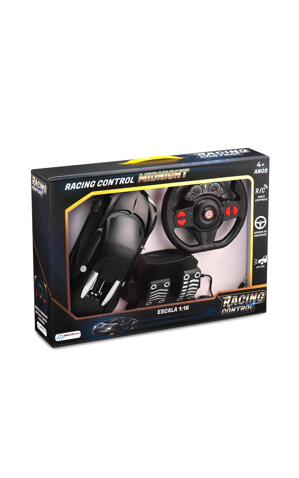 Possui pedais para aceleração e o controle remoto é em formato de volante, com sensor de gravidade para movimentação direita e esquerda. Alcança distância de até 10 metros em escala 1:16, fio de pedal com 1 metro e 40 centímetros. O carrinho possui luz de LED que acendem os faróis, com Racing Control da Multikids a diversão é garantida!