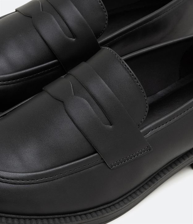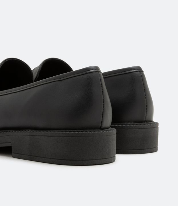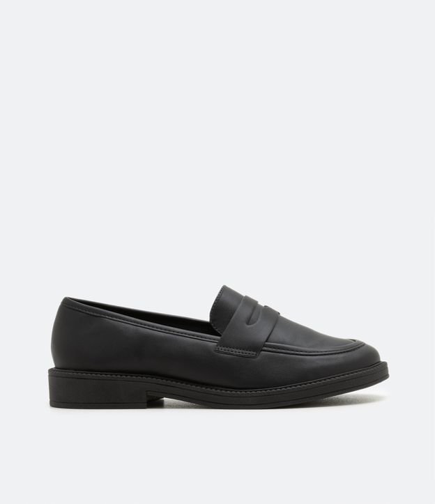 Sapato mocassim, com salto baixo e sem fechamento.